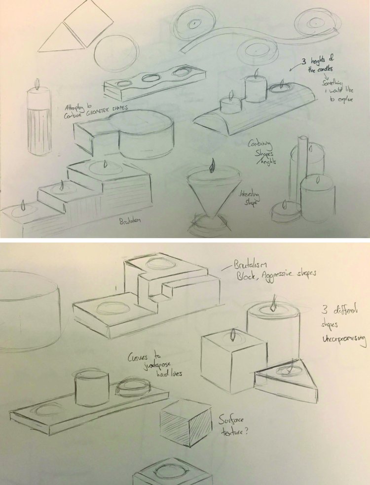 I wanted to create branding that unified the three shapes and colours of the product. This would help customers to identify the product as a set of three. Complete packaging such as a container or box was not necessary given the layout and system used in the CCA shop, so I decided to use a simple wrap around the cylinder candle holder, allowing the branding to be accessible without distracting attention from the product.