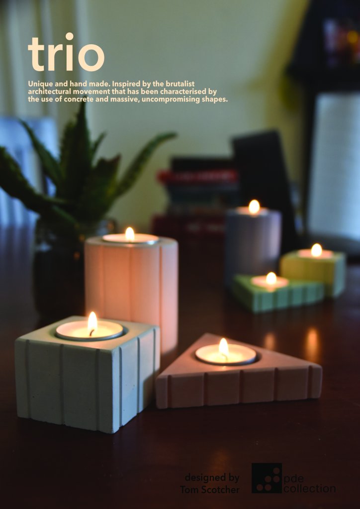 Trio is a set of unique and handmade concrete candle holders. They are inspired by the brutalist architectural movement that was characterised by the use of concrete and massive, uncompromising shapes.